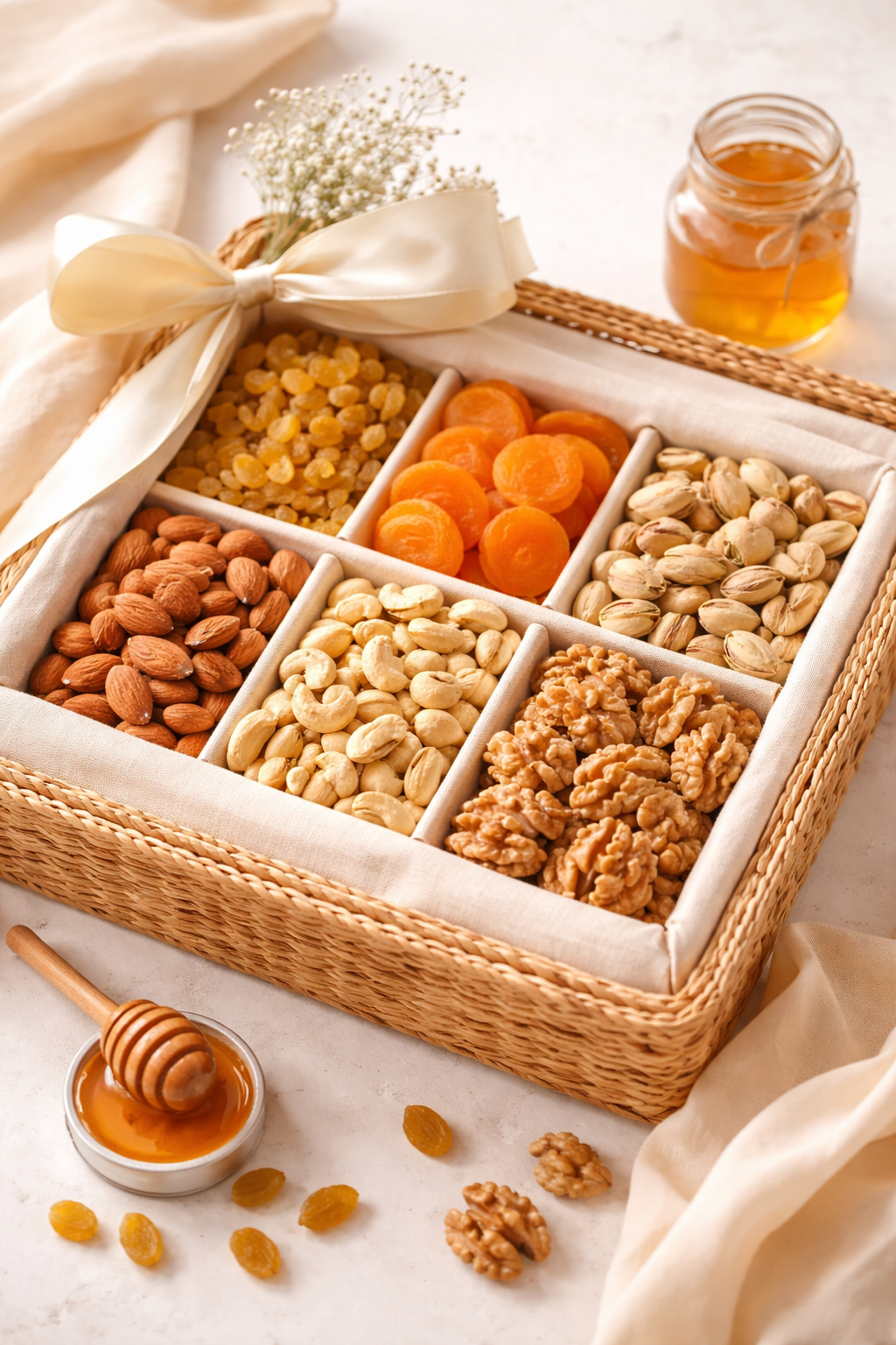 At Zains Dates & Nuts, we create customized nuts & dry fruits trays and hampers, beautifully designed with premium quality ingredients—perfect for elegant gifting and special occasions.